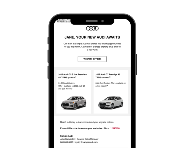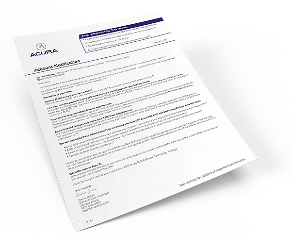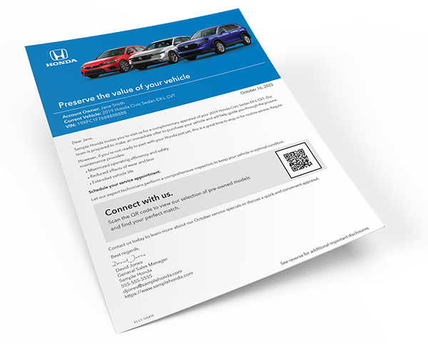 Features a personalized, handwritten style note highlighting special sales events or new vehicle launches.